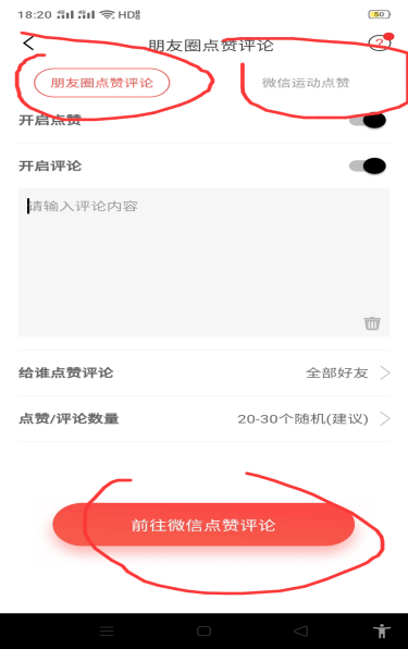 这个界面可以选择朋友圈点赞评论和微信运动点赞评论,设置评论内容,点击前往微信点赞评论。