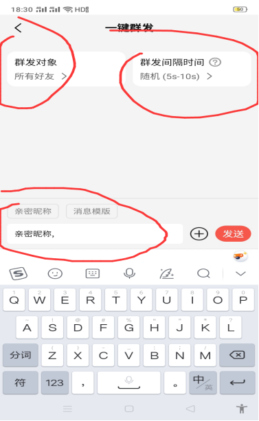 这个界面可以设置群发对象,群发间隔时间,还可以看到