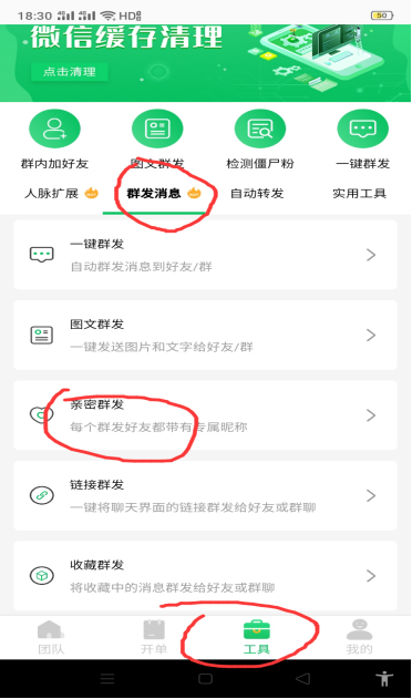 “工具”,点击“群发消息”然后点击“亲密群发”。